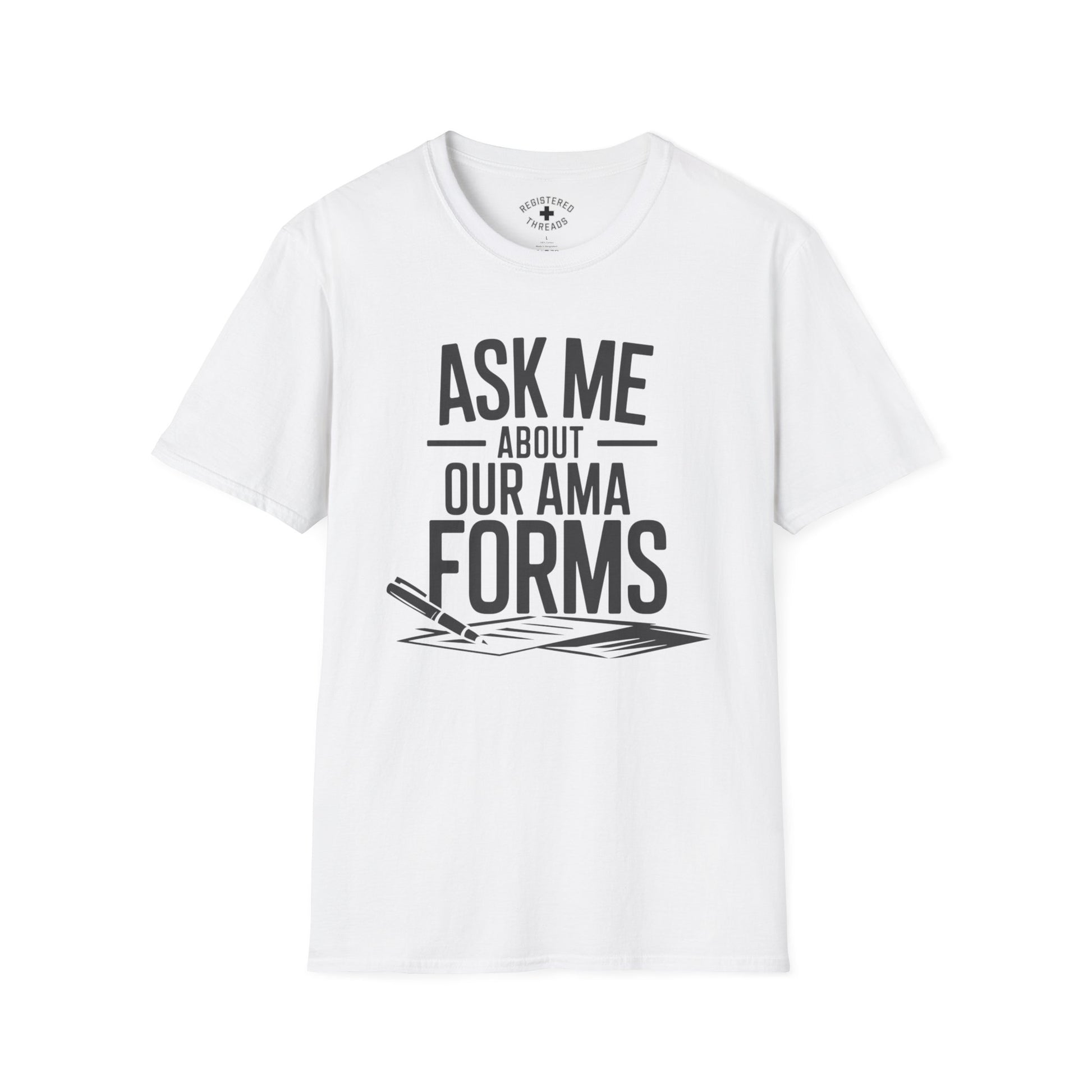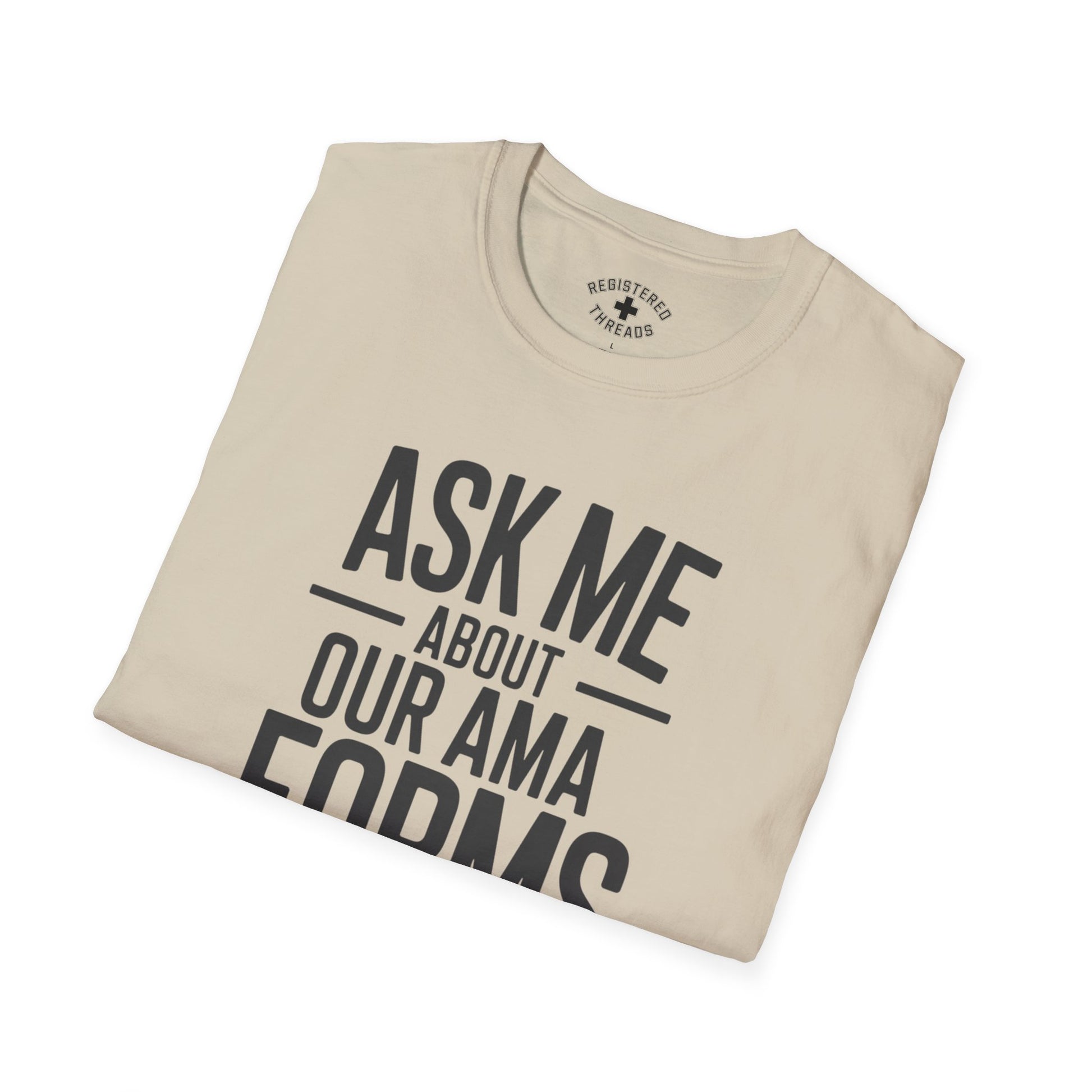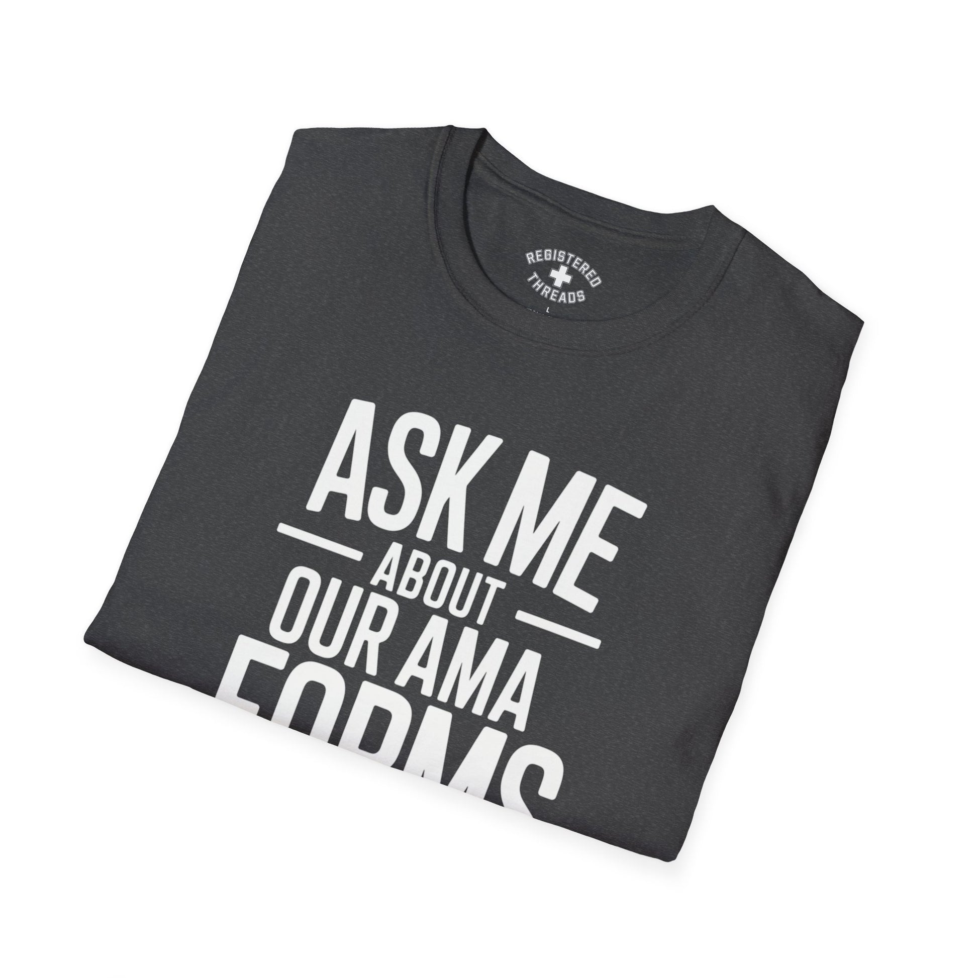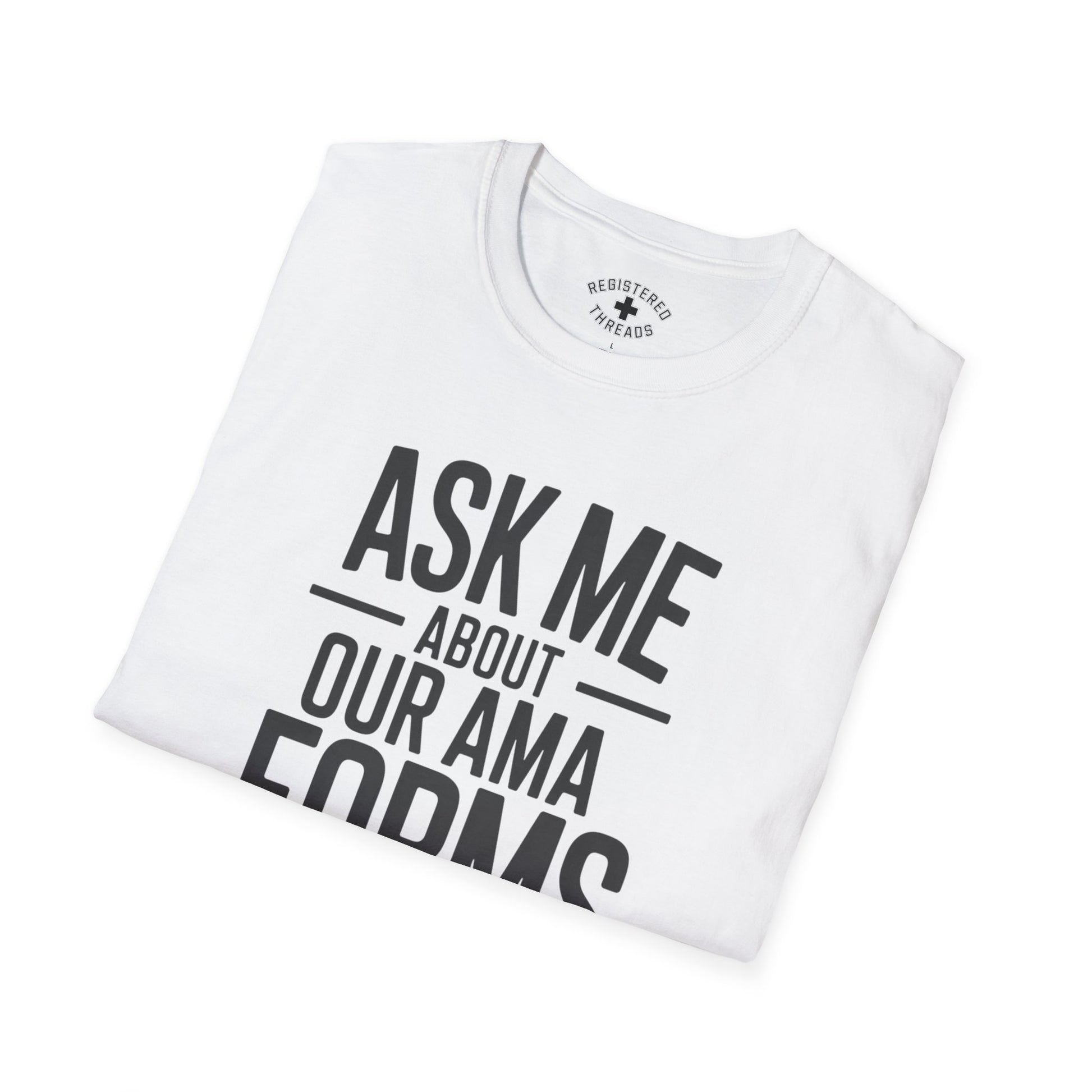 "Ask Me About Our AMA Forms" is a Registered Threads original design printed on a premium "softstyle" tee.