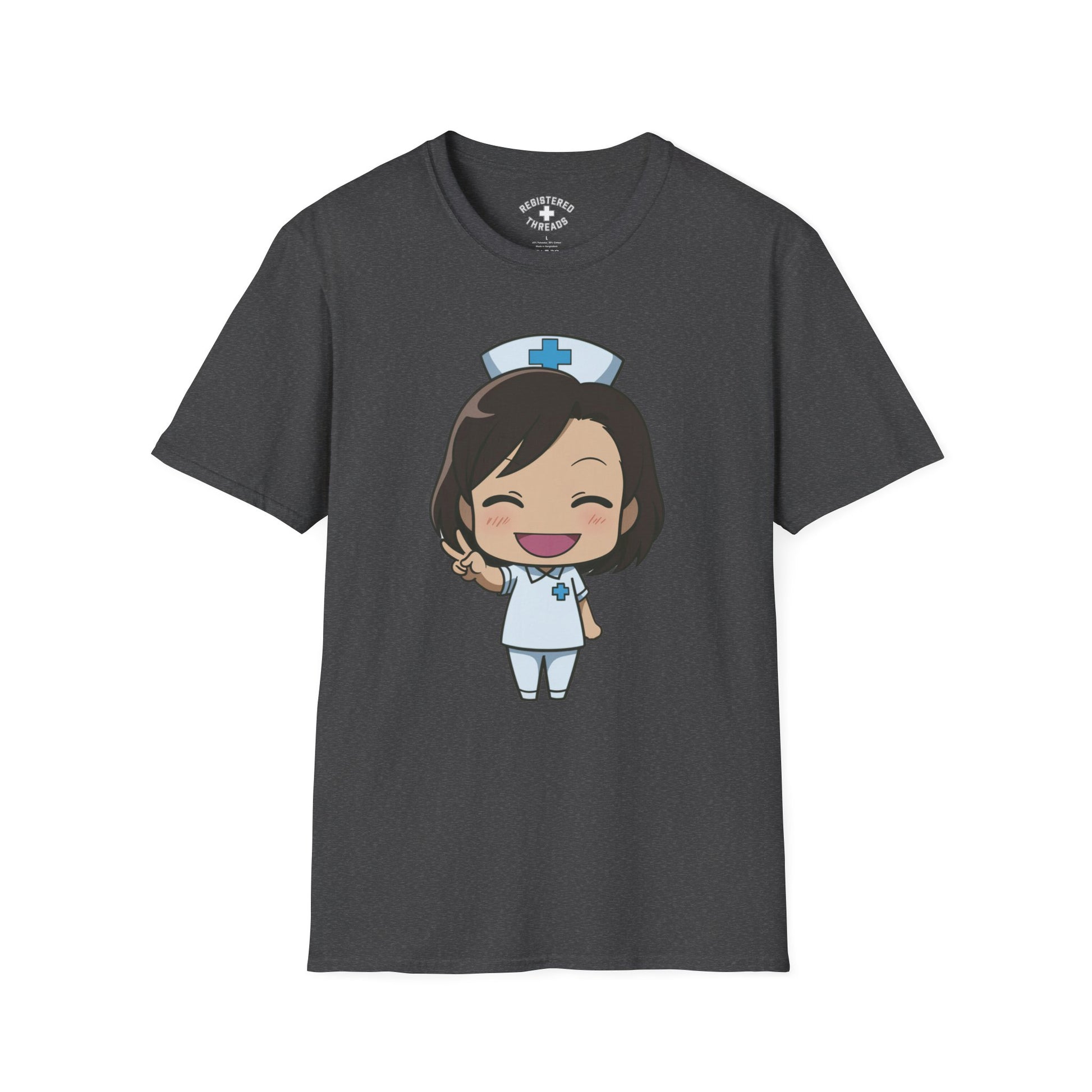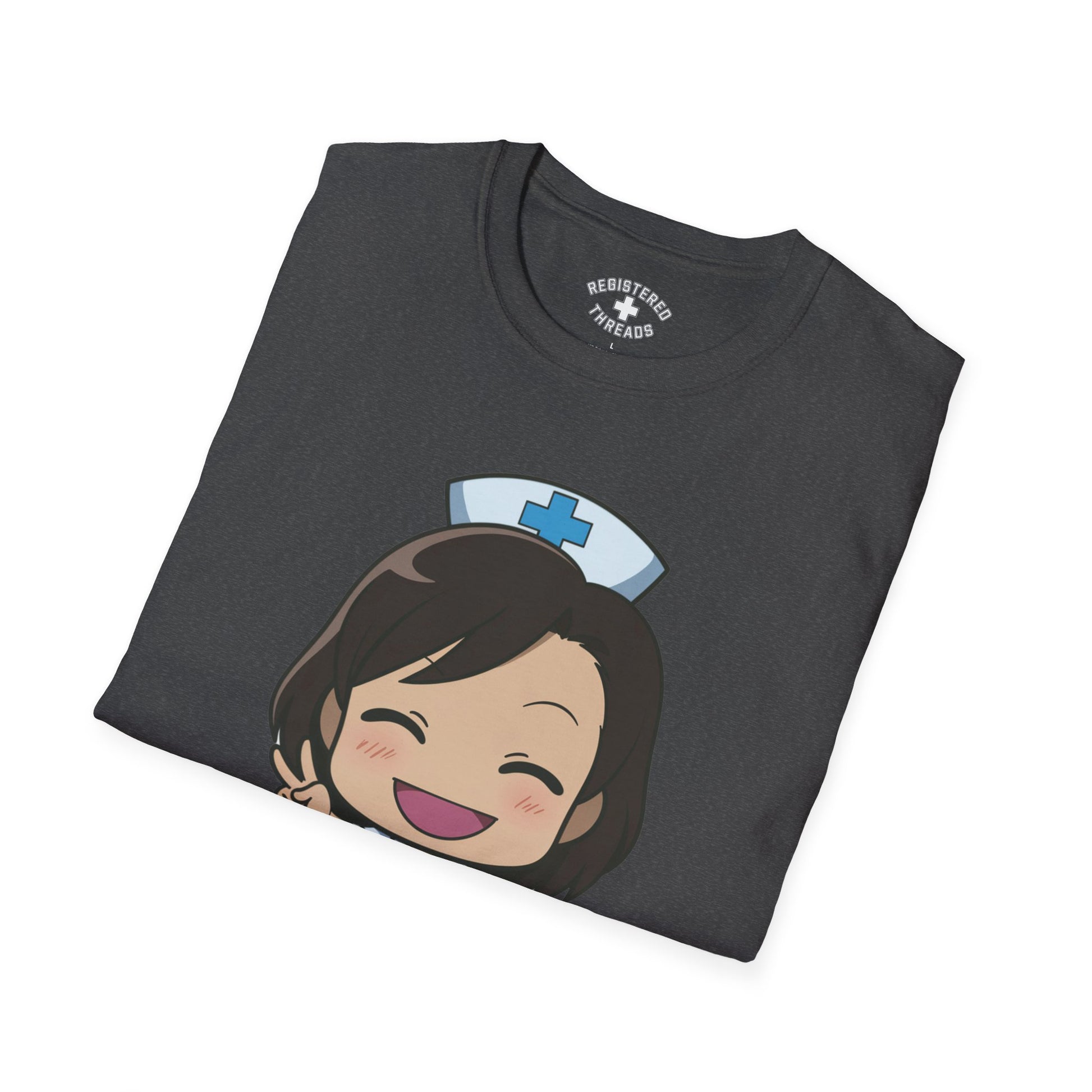 "Chibi Nurse" is a Registered Threads original design printed on a premium "softstyle" tee.