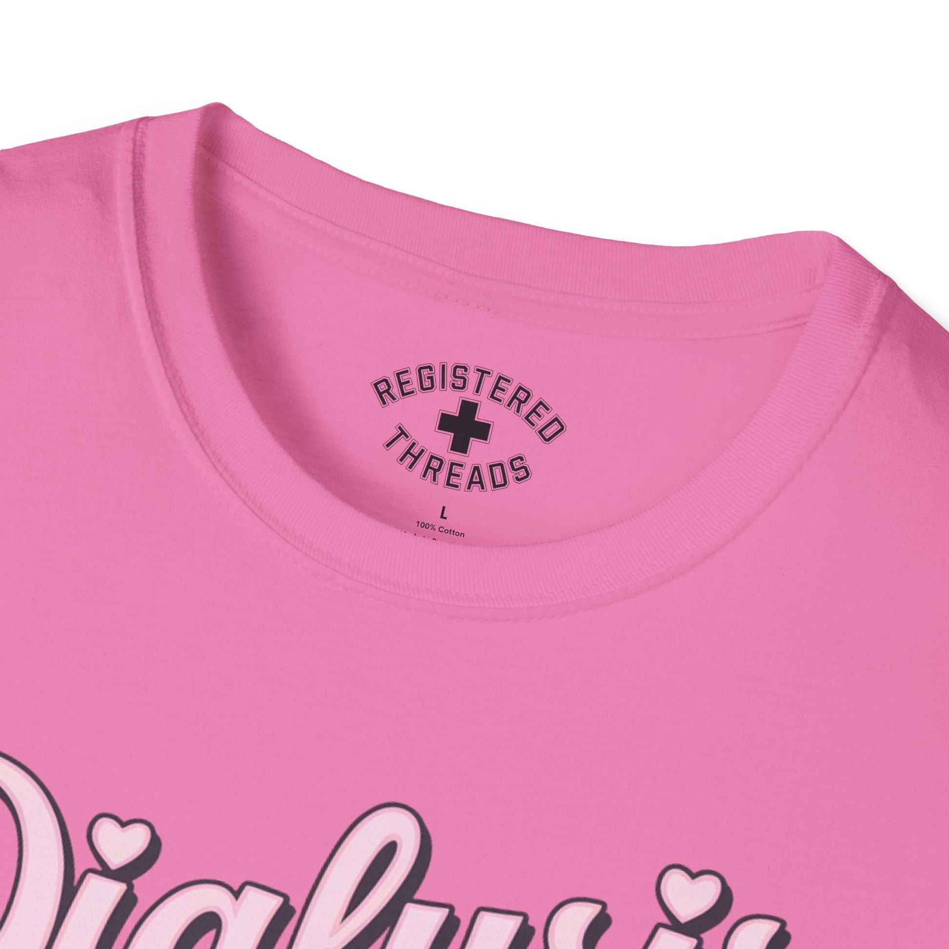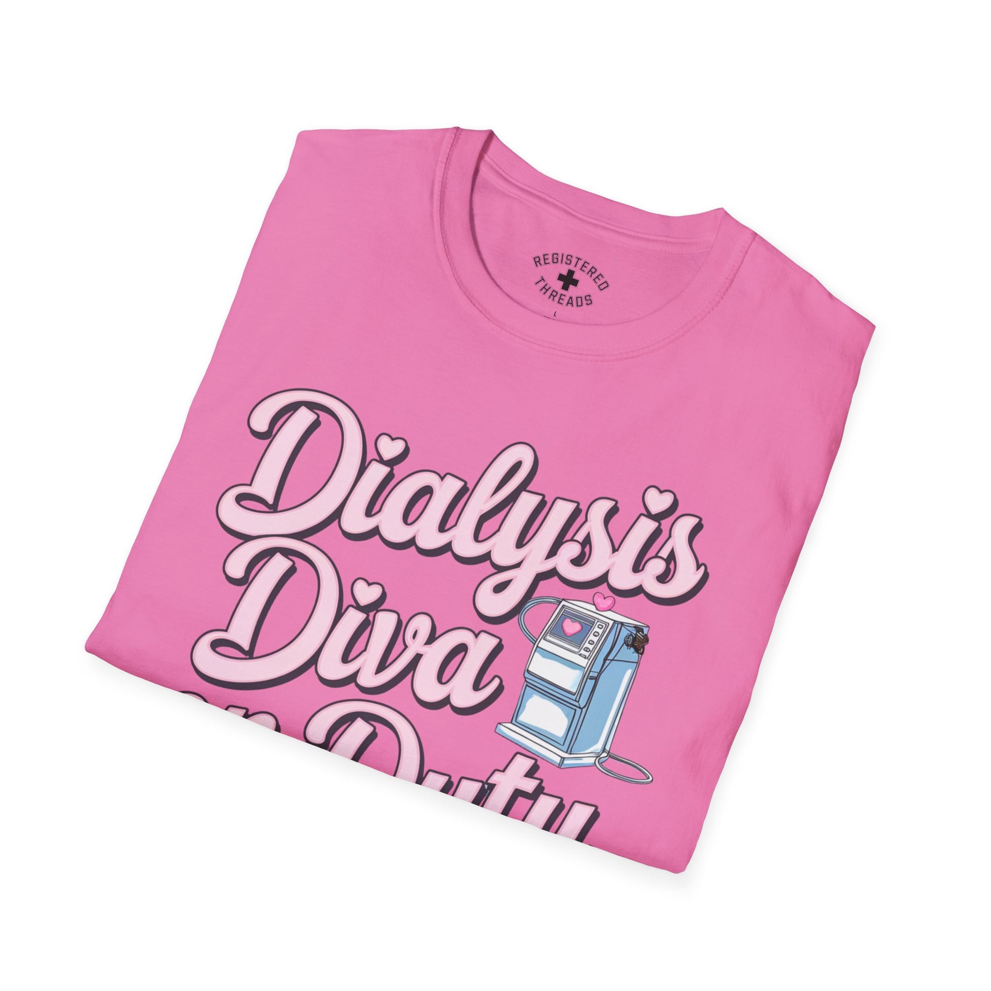 "Dialysis Diva on Duty" is a Registered Threads original design printed on a premium "softstyle" tee.