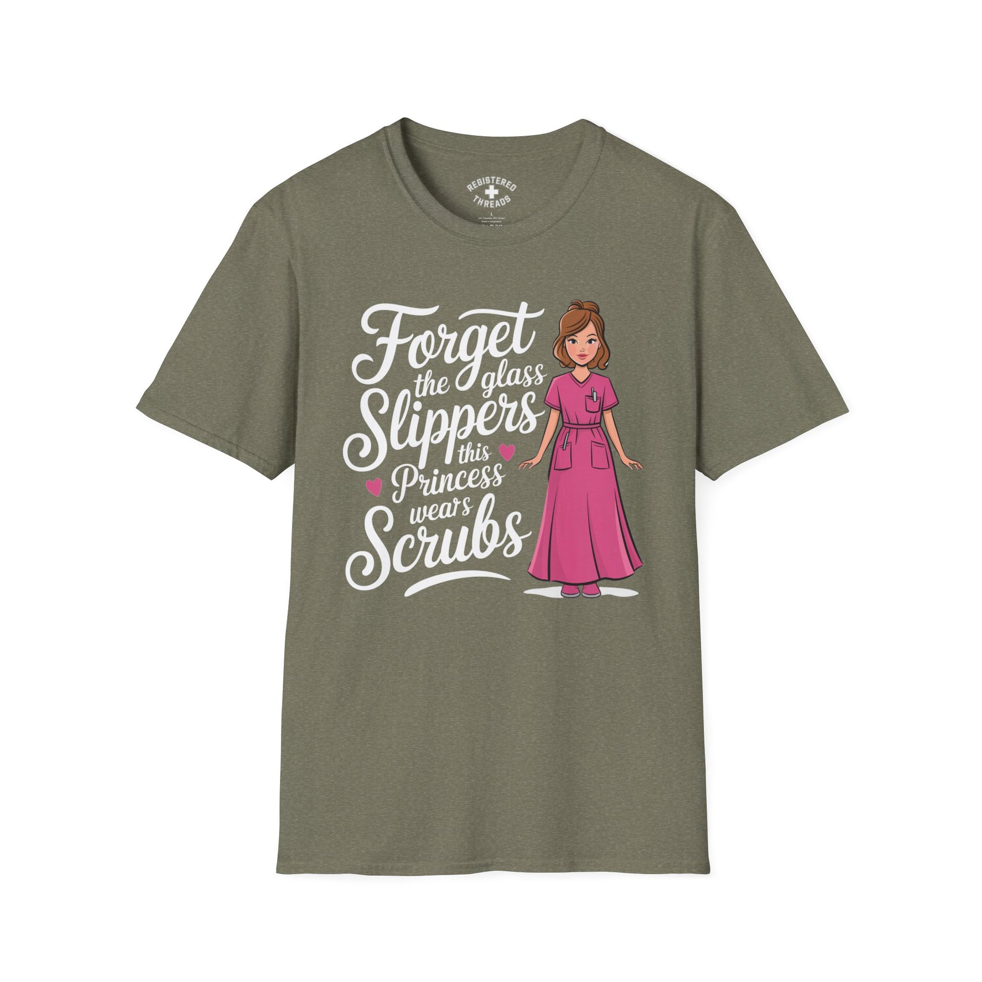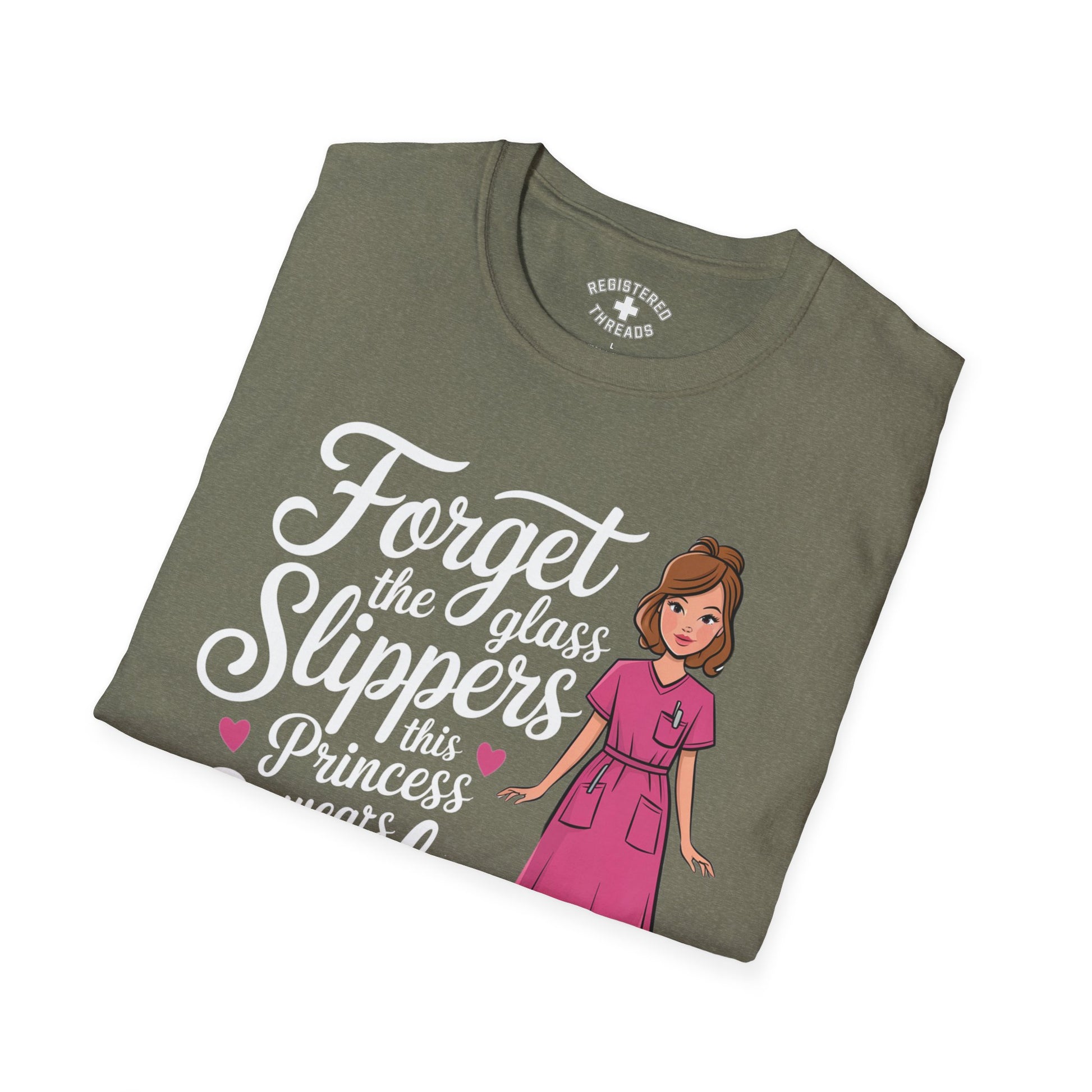"Forget the Glass Slippers" is a Registered Threads original design printed on a premium "softstyle" tee.