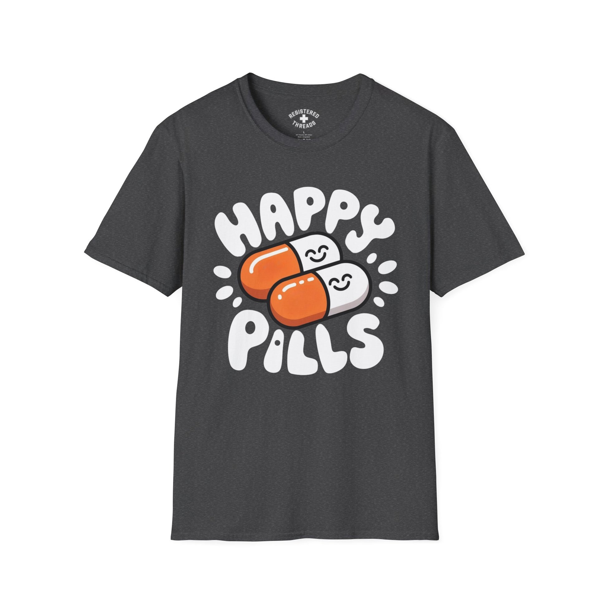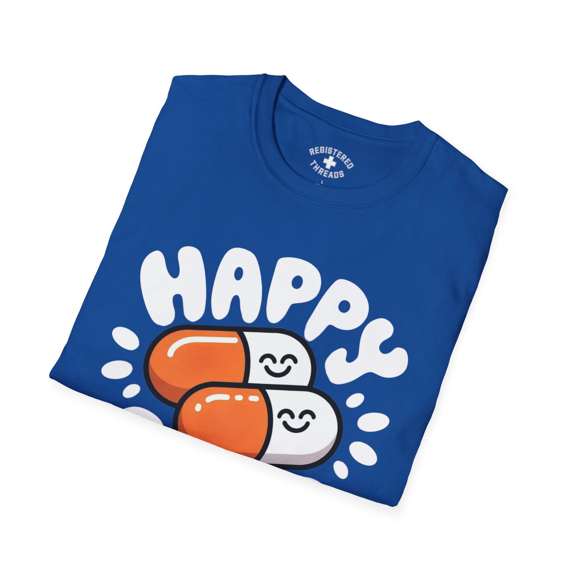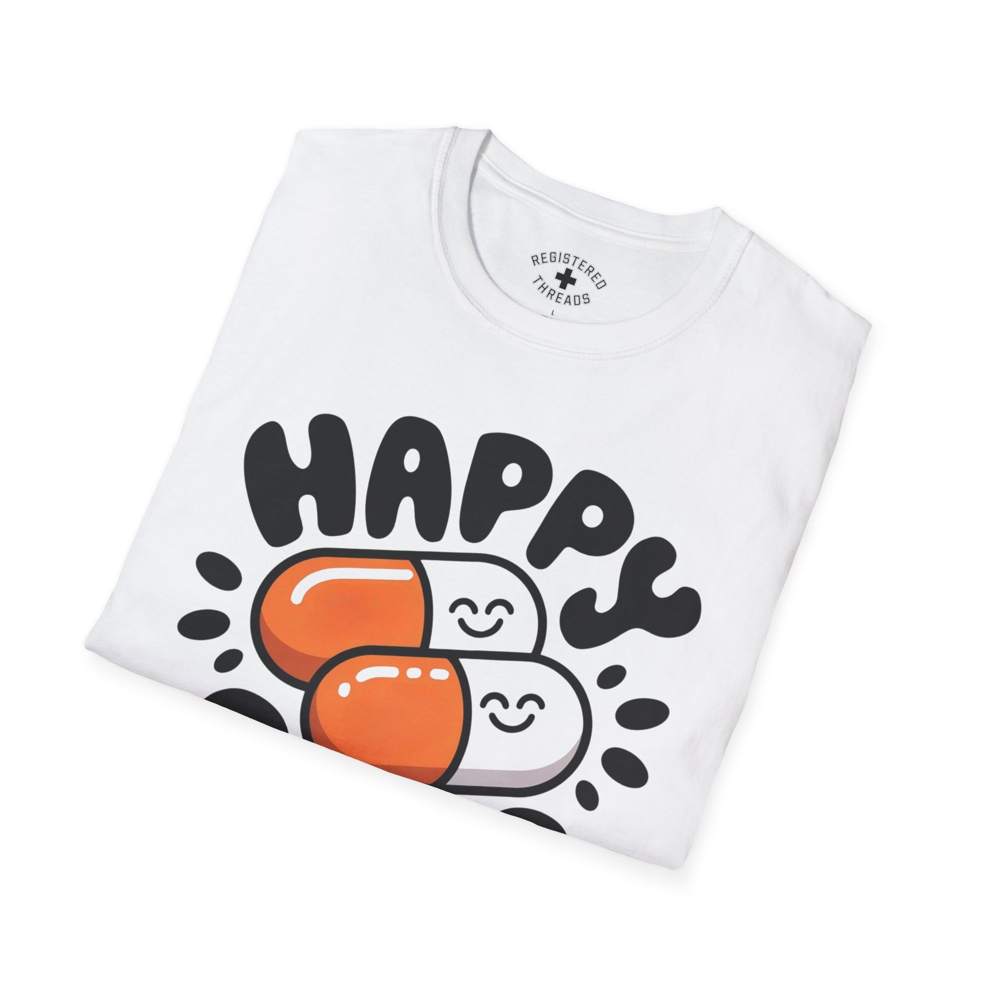 "Happy Pills" is a Registered Threads original design printed on a premium "softstyle" tee.