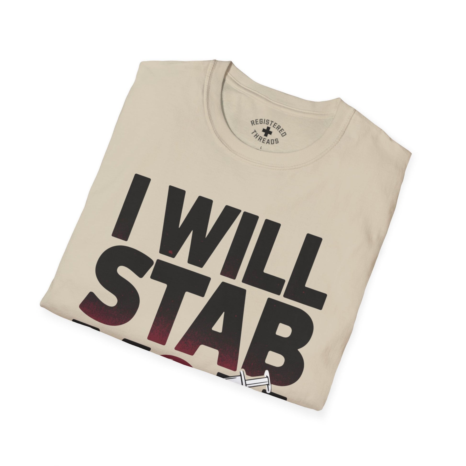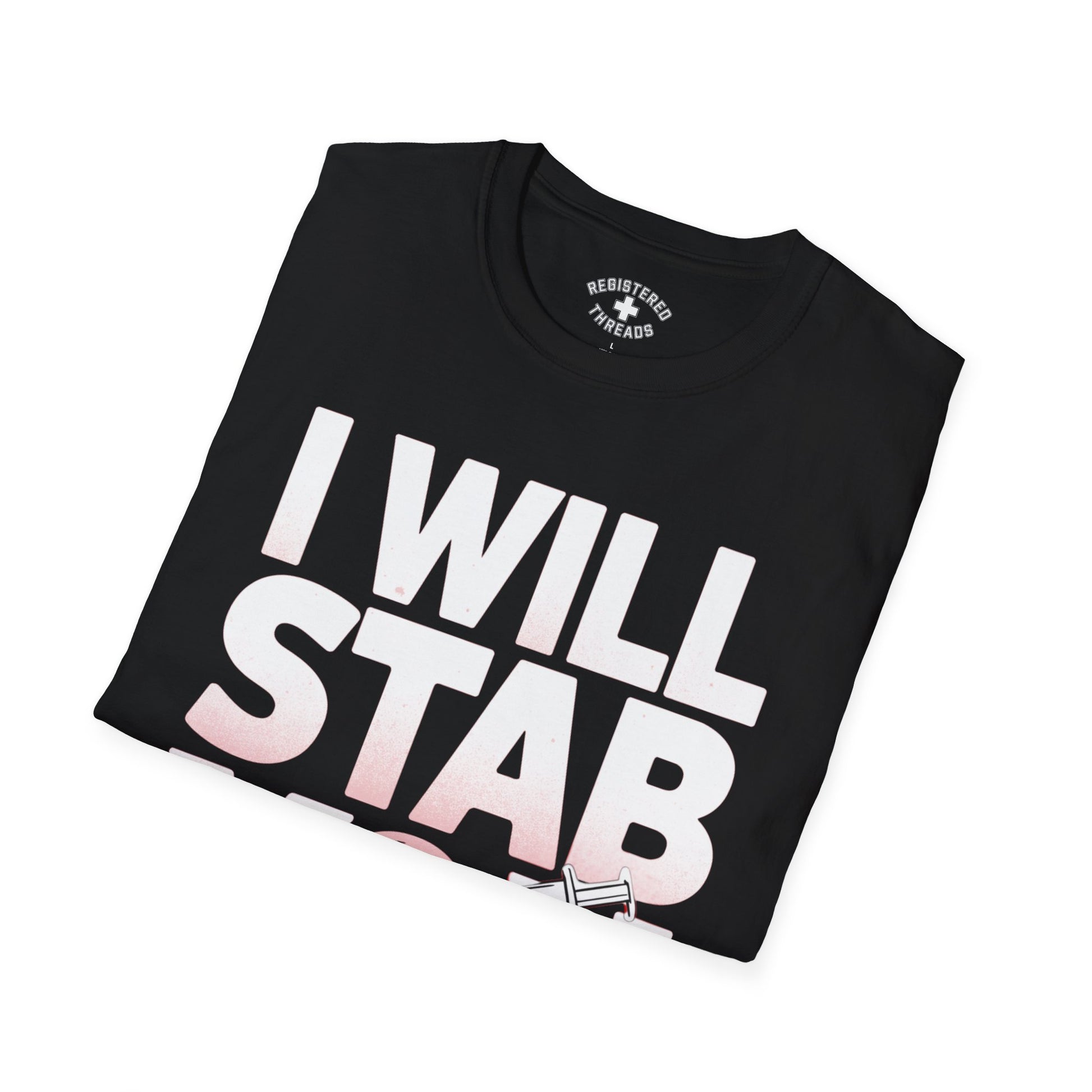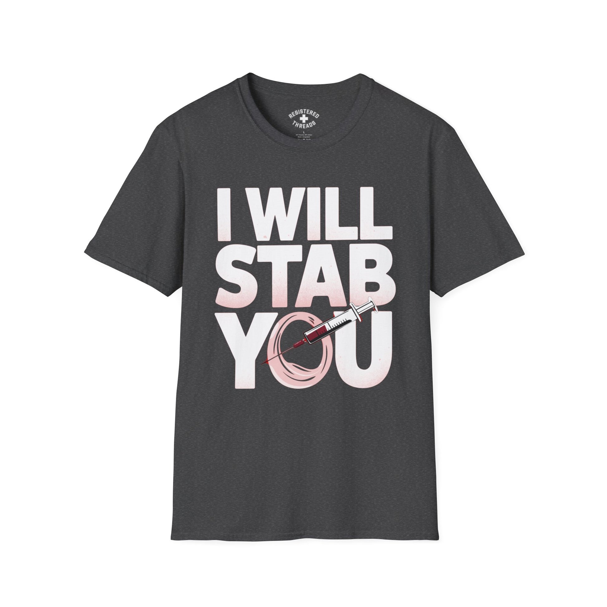 "I Will Stab You" is a Registered Threads original design printed on a premium "softstyle" tee.