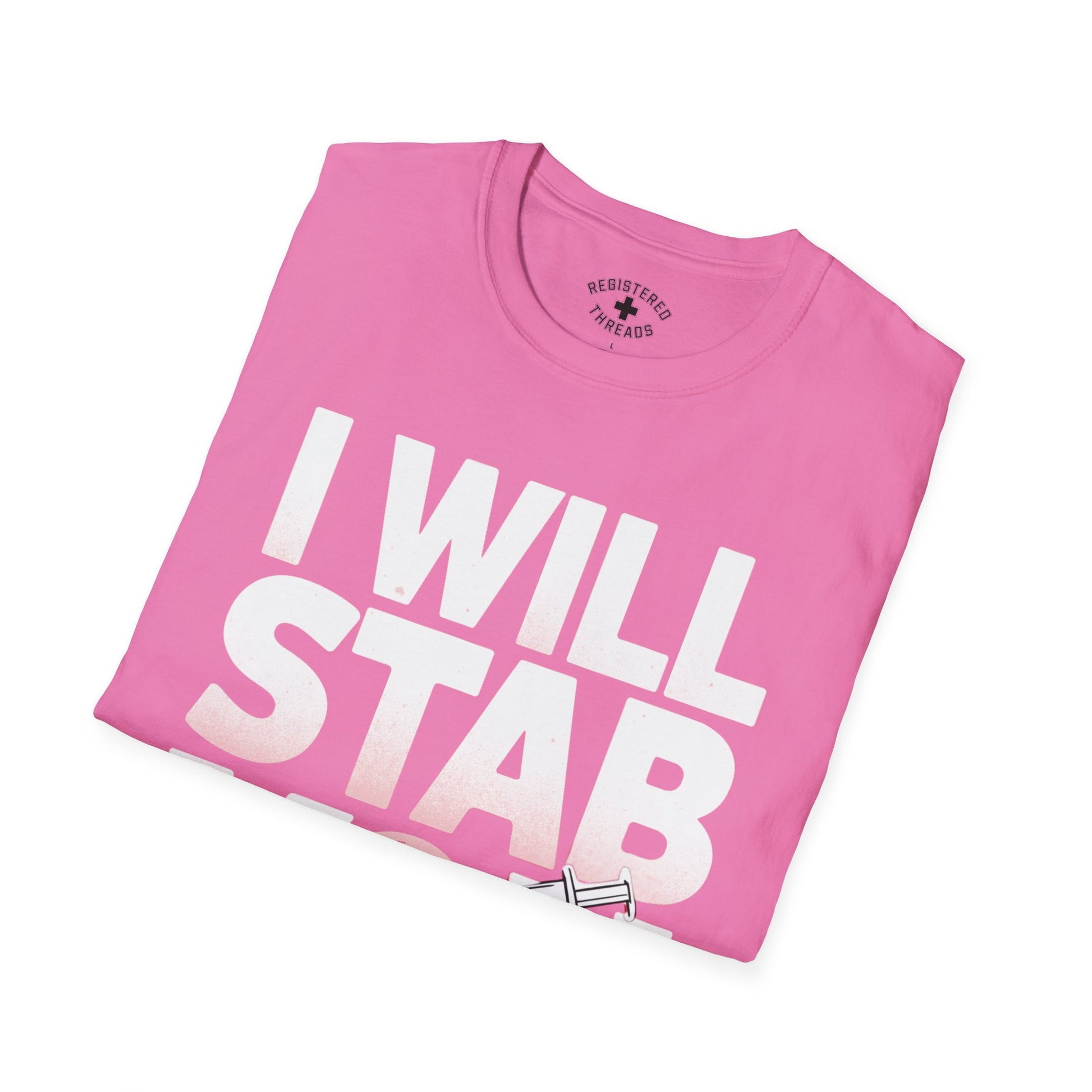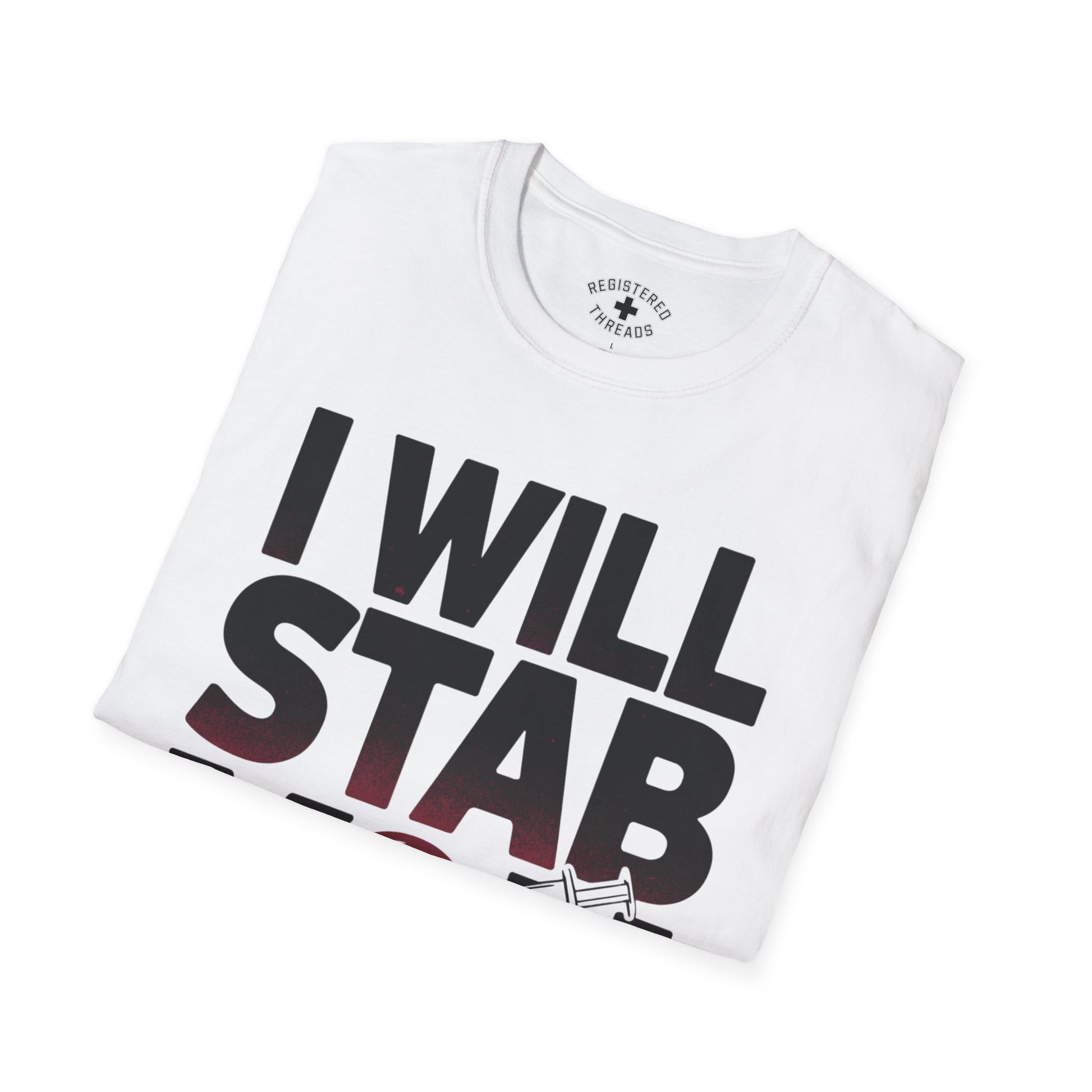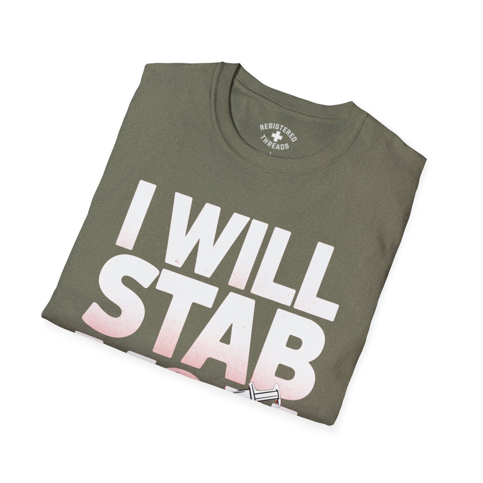 "I Will Stab You" is a Registered Threads original design printed on a premium "softstyle" tee.