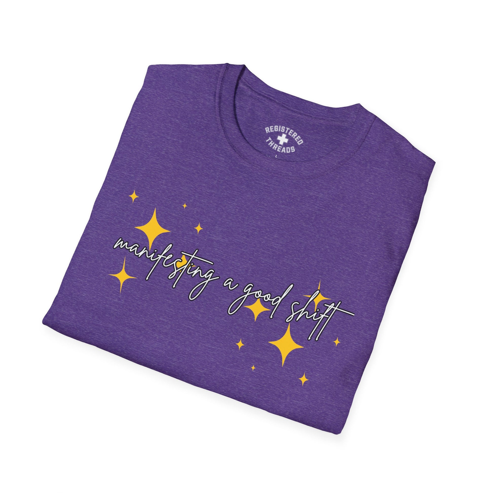 "Manifesting a Good Shift" is a Registered Threads original design printed on a premium "softstyle" tee.