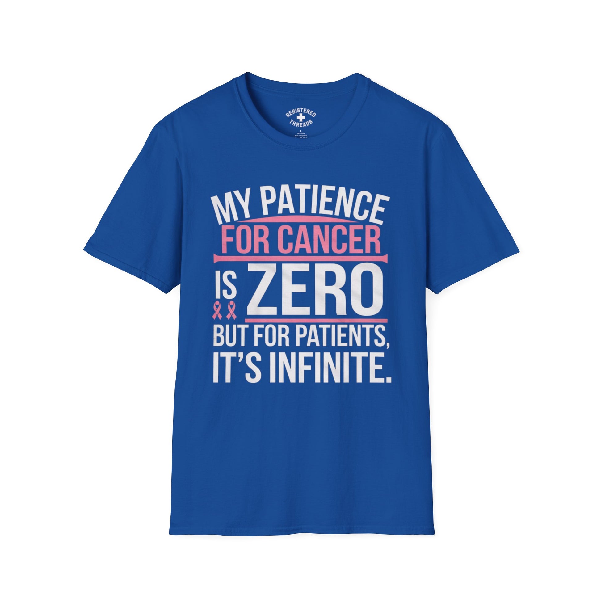 "No Patience for Cancer" is a Registered Threads original design printed on a premium "softstyle" tee.