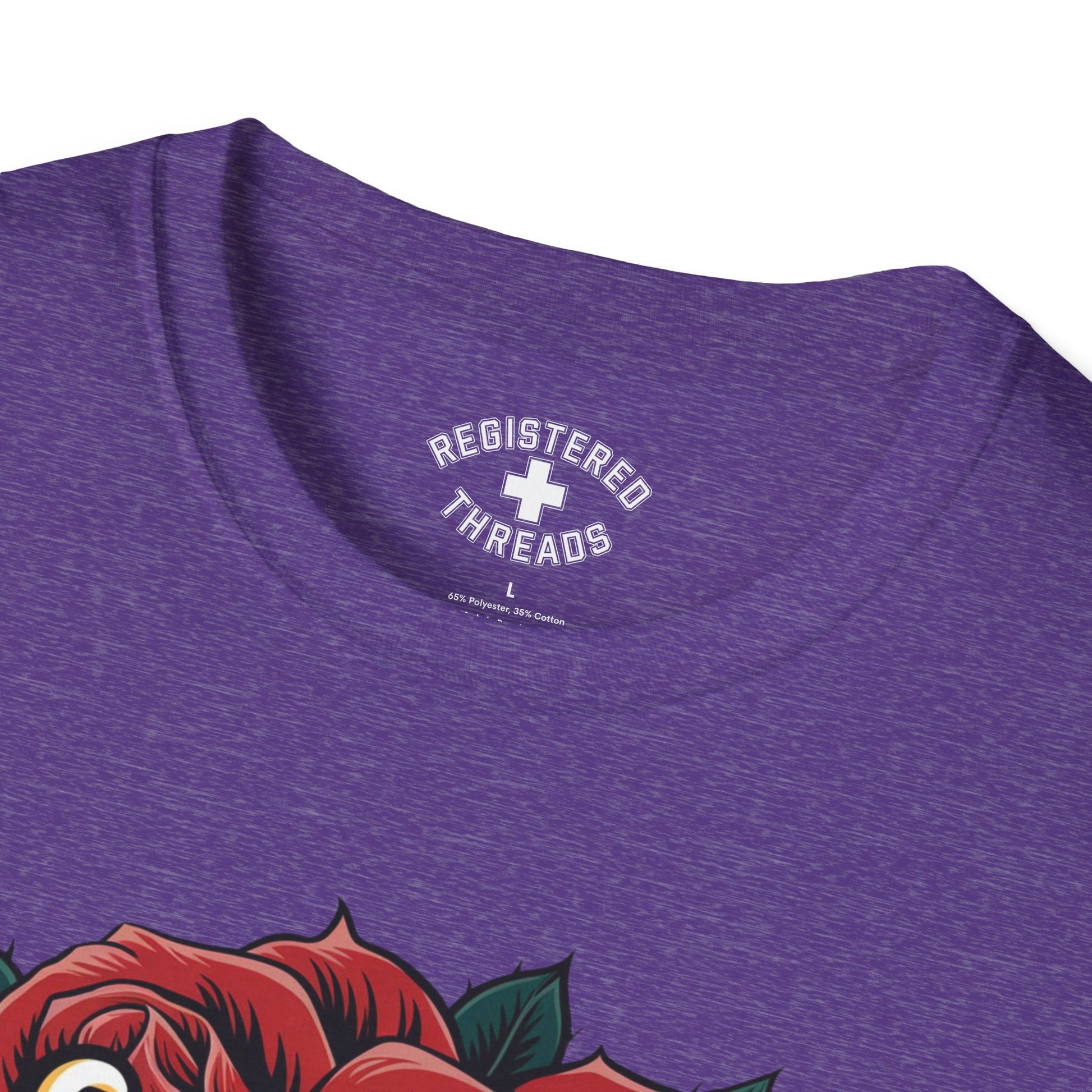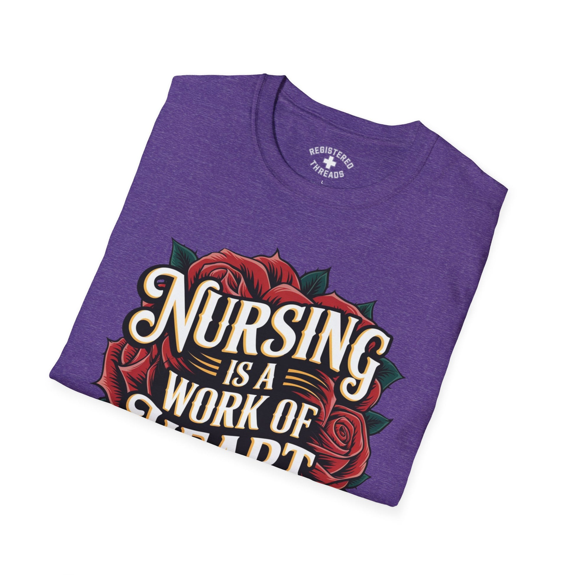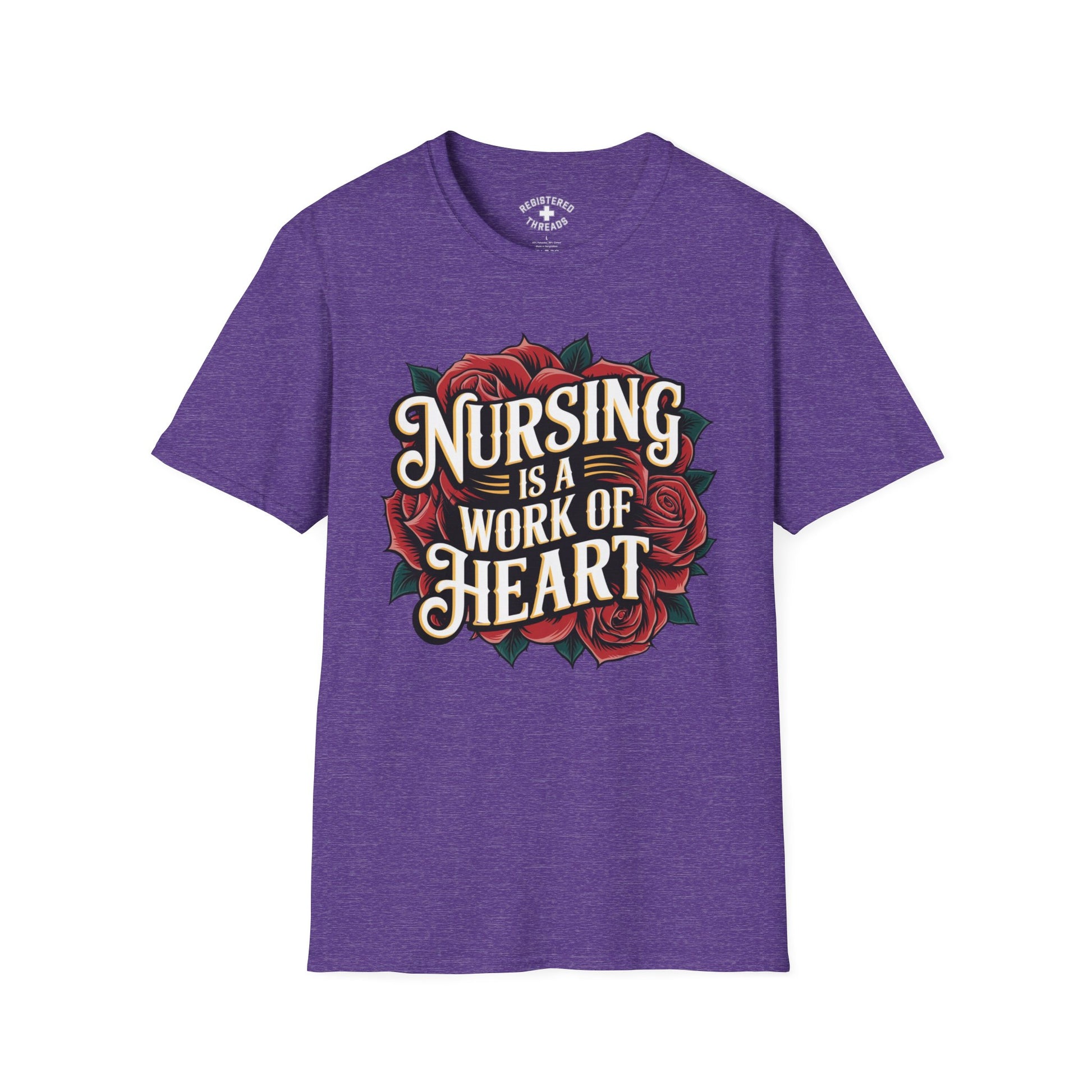 "Nursing is a Work of Heart" is a Registered Threads original design printed on a premium "softstyle" tee.