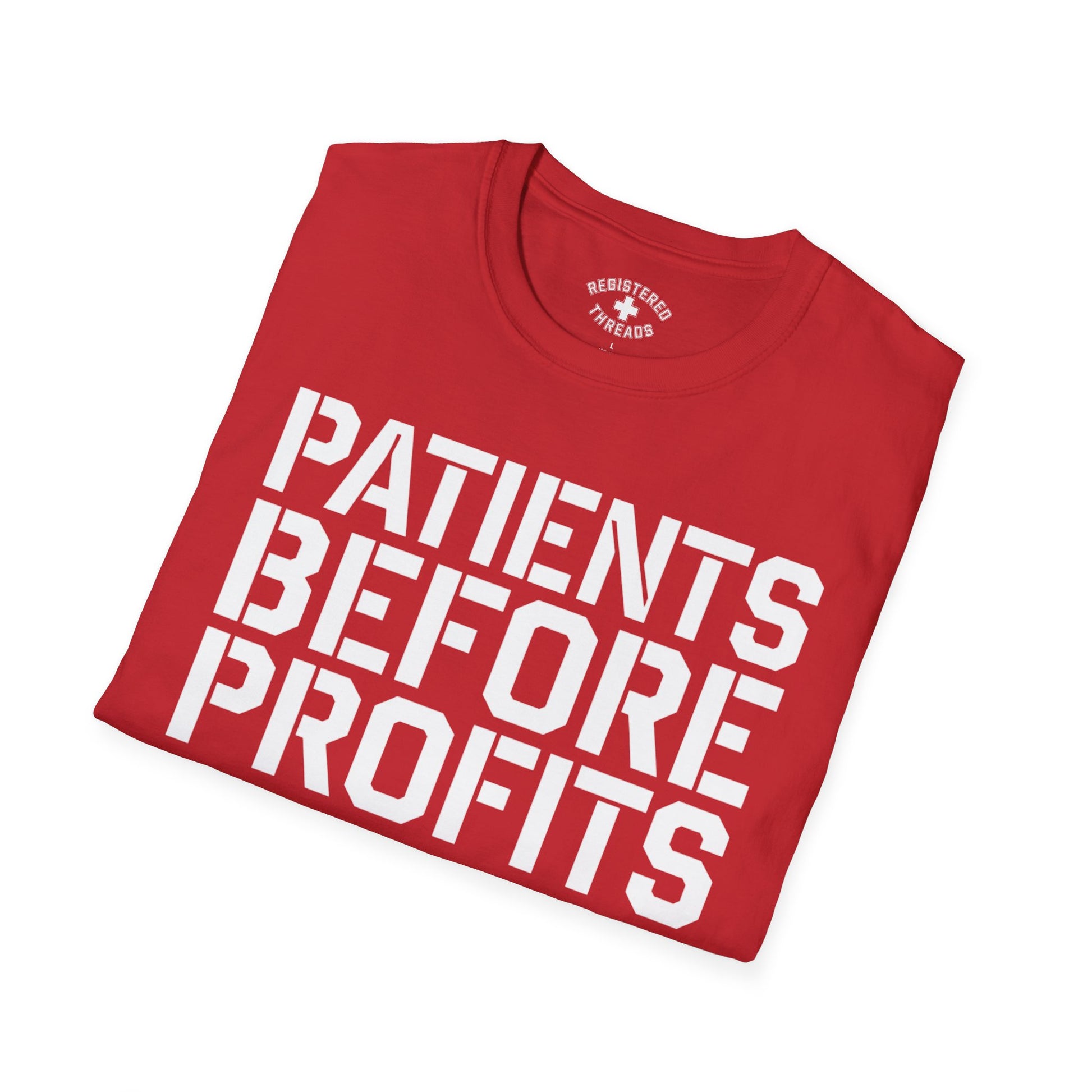 "Patients Before Profits" is a Registered Threads original design printed on a premium "softstyle" tee.