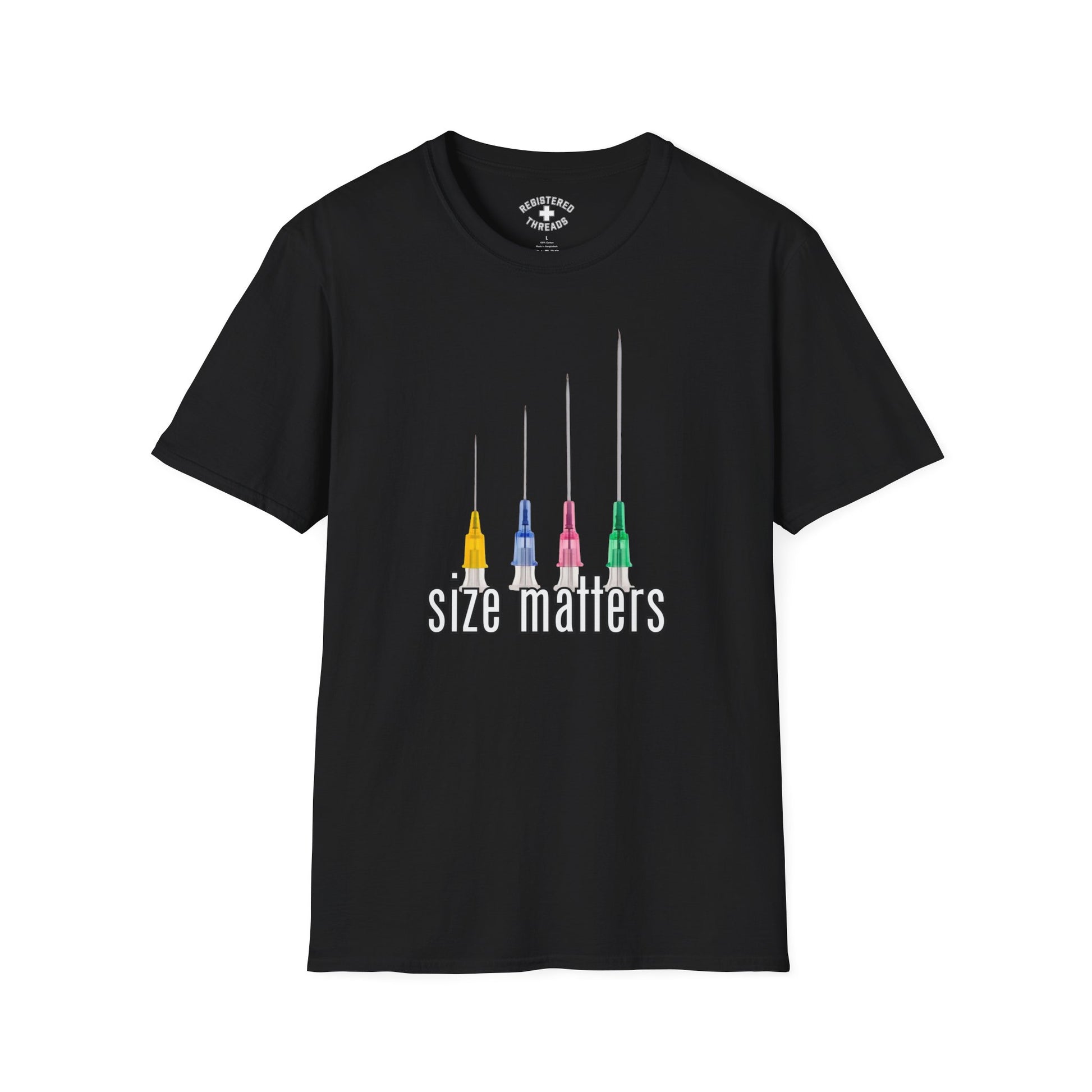 "Size Matters." is a Registered Threads original design printed on a premium "softstyle" tee.