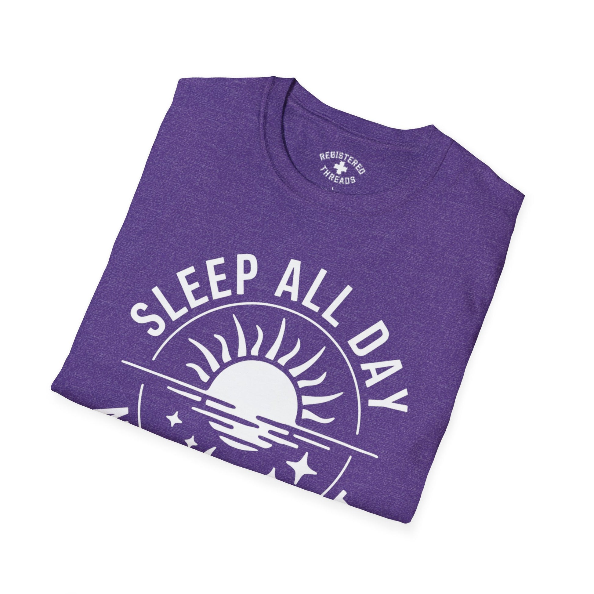 "Sleep All Day, Nurse All Night" is a Registered Threads original design printed on a premium "softstyle" tee.