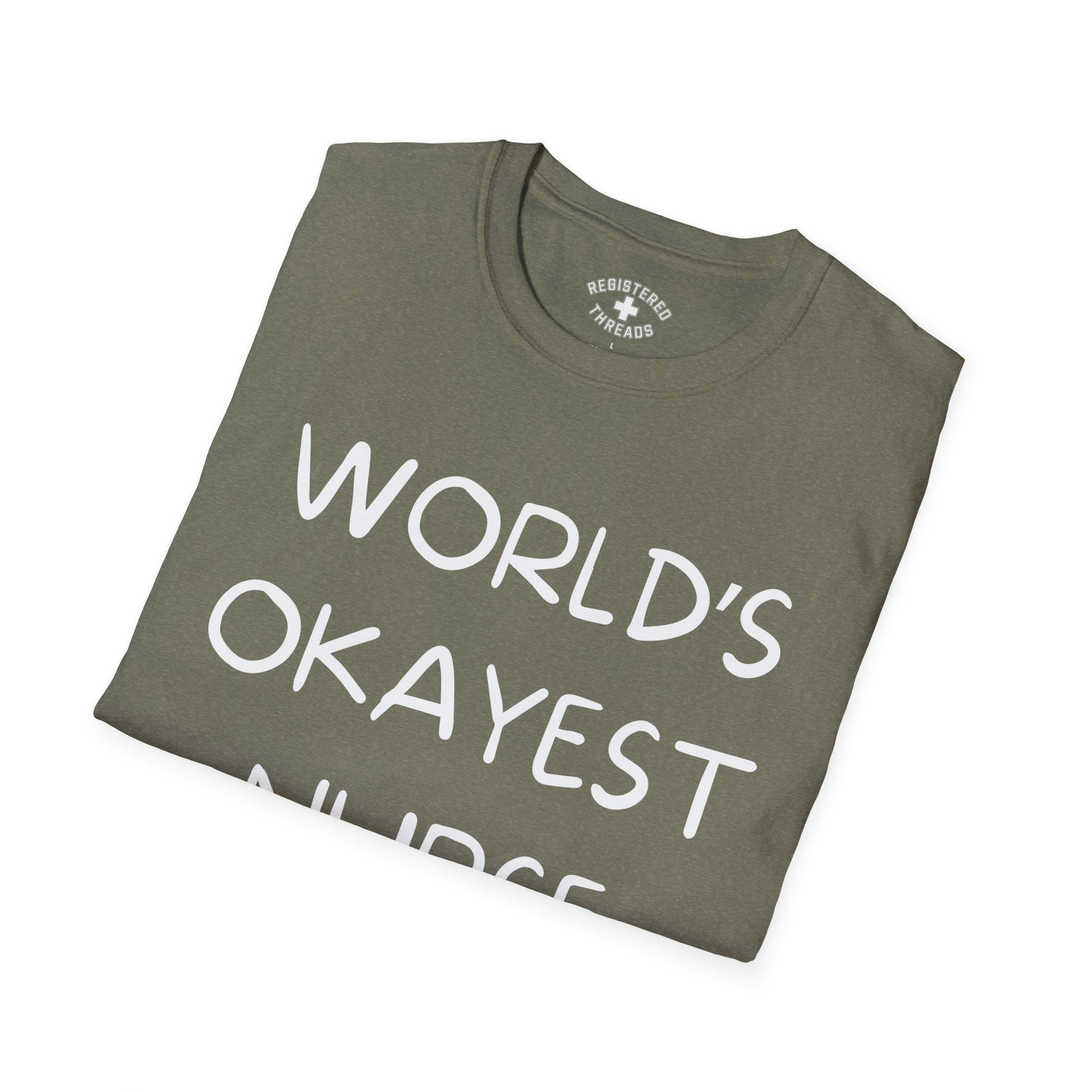 "World's Okayest Nurse" is a Registered Threads original design printed on a premium "softstyle" tee.